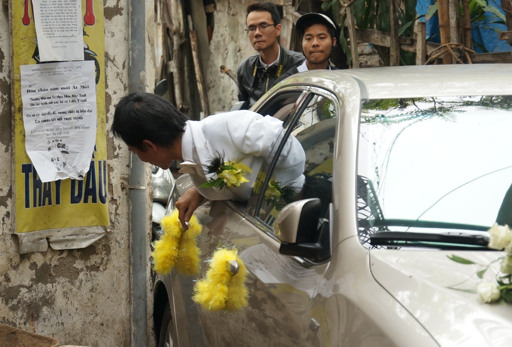 | Xe đón dâu của Thanh Thanh Hiền và Chế Phong được trang trí khá đơn giản với những bông hoa hồng trắng và vàng xen kẽ. |