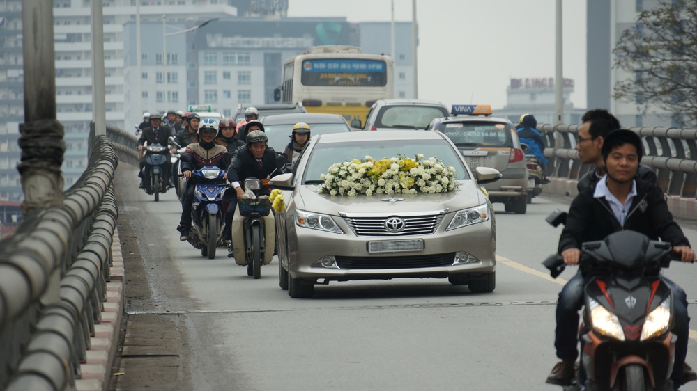 | Sau khi làm lễ rước dâu tại nhà gái, xe đón dâu đưa cặp uyên ương tới khu vực Nhà Hát Lớn chụp ảnh trước khi về nhà riêng ở Đào Tấn. |