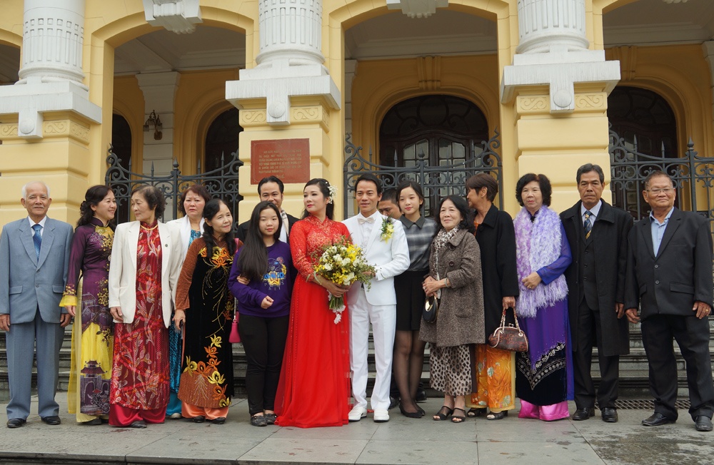 | Thanh Thanh Hiền - Chế Phong chụp ảnh lưu niệm cùng họ hàng đôi bên trước cửa Nhà hát Lớn. |