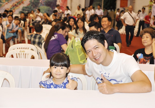 Rất dạn dĩ, con gái cưng của diễn viên - MC Bình Minh đã cùng bố lên sân khấu tặng quà cho các anh chị học sinh có hoàn cảnh khó khăn trong chương trình "Trung thu yêu thương".