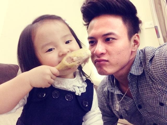 | Chia sẻ bức ảnh này trên trang cá nhân, Hồng Đăng hóm hỉnh viết: "Khi còn bé ba cũng thích ăn đùi gà như con vậy. Nhưng ba thua con một điểm đó là ba không thể ăn được 2 cái đùi gà một lúc như con...". |