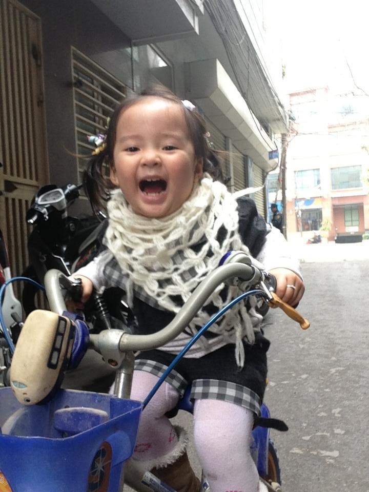Nam diễn viên hào hứng khoe ảnh con gái hớn hở đi xe đạp. Anh viết: "Con đã biết đếm và biết mặt chữ. Biết dùng từ thể hiện cảm xúc. Giờ ra đường thấy chữ gì là đọc chữ đấy. He he hay thật. Con tập đi xe đạp luôn rồi..."