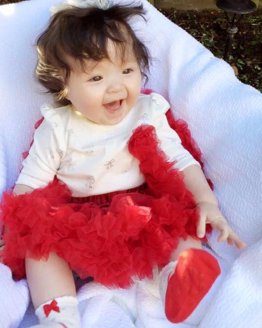 | Con gái 4 tháng tuổi được Elly Trần diện trang phục màu đỏ trắng để đón năm mới. Mỗi ngày, bé Mộc Trà đều được mẹ diện những trang phục mới mẻ, khác nhau. Vì bé hay cười nên Elly gọi con là em bé vui tính, bà bán mì... rất dễ thương. |