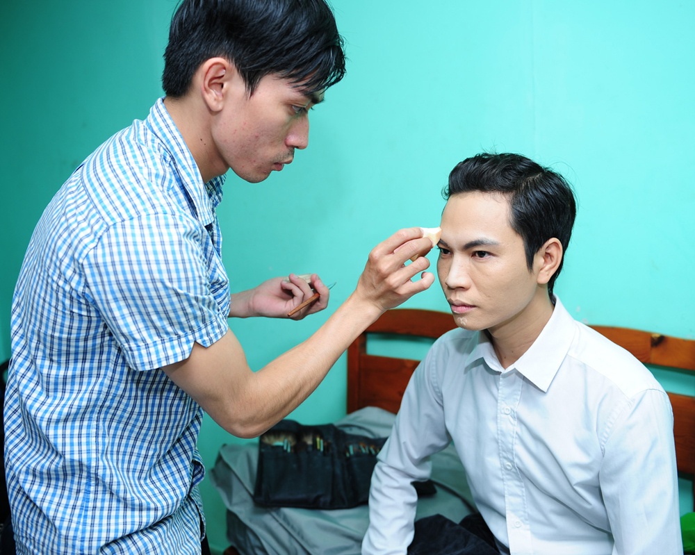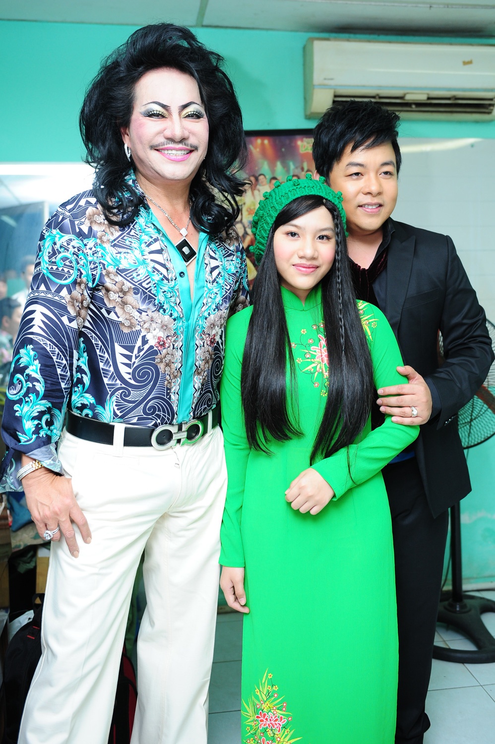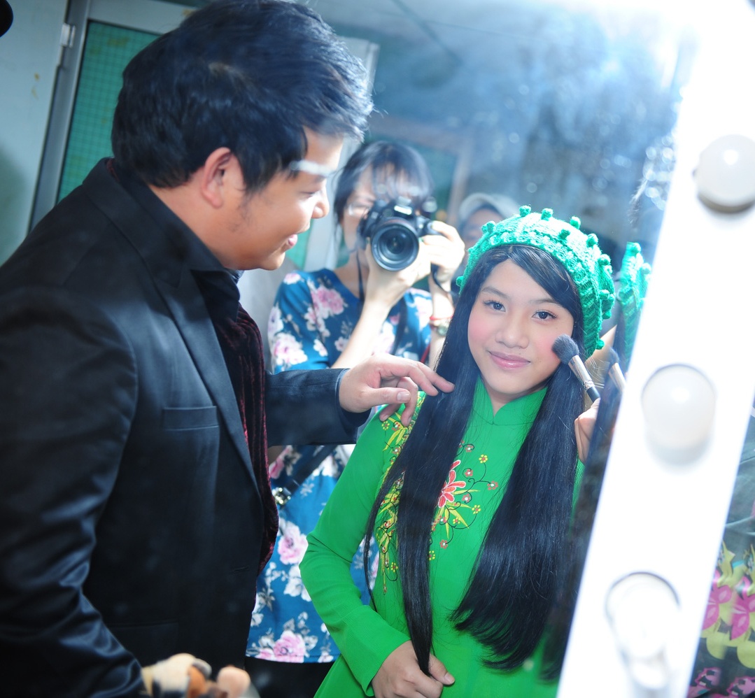 | Cô bé được chăm sóc kỹ lưỡng trong hậu trường. Huyền Trân chia sẻ thêm, trước giờ diễn, đích thân cha nuôi Quang Lê dẫn đến tiệm bán tóc giả để lựa bộ tóc ưng ý nhất. |