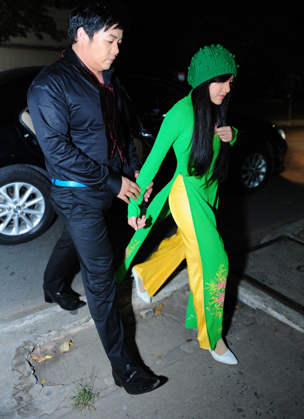 | Ở buổi họp báo live show Hát trên quê hương hôm 23/4, Quang Lê và Phi Nhung xảy ra tranh luận về trang phục của Huyền Trân. Nam ca sĩ gốc Huế không muốn con gái nuôi mặc áo nâu vì lo sợ dư luận hiểu lầm cô bé núp bóng nhà tu hoạt động nghệ thuật. Anh khuyên cô bé diện trang phục bình thường, đội tóc giả hát. |