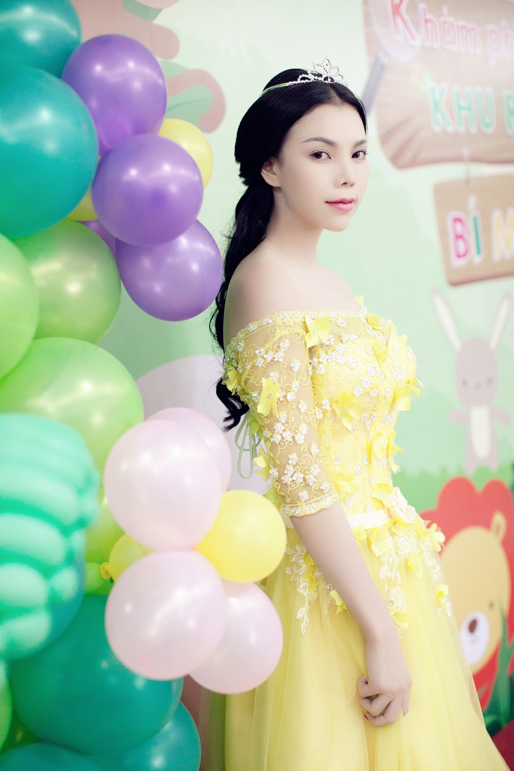| Trà Ngọc Hằng khoe làn da trắng sứ gợi cảm trong chiếc đầm vàng duyên dáng. |