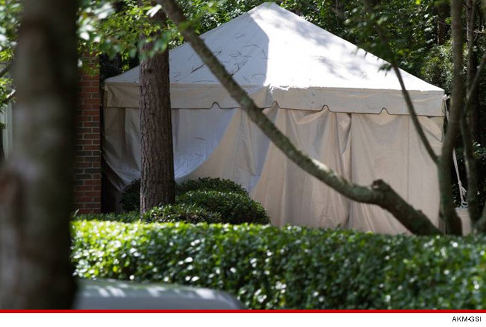 | Chiếc lều trắng bí ẩn được đồn đoán để bí mật đưa thi thể nữ ca sĩ ra khỏi bệnh viện. |