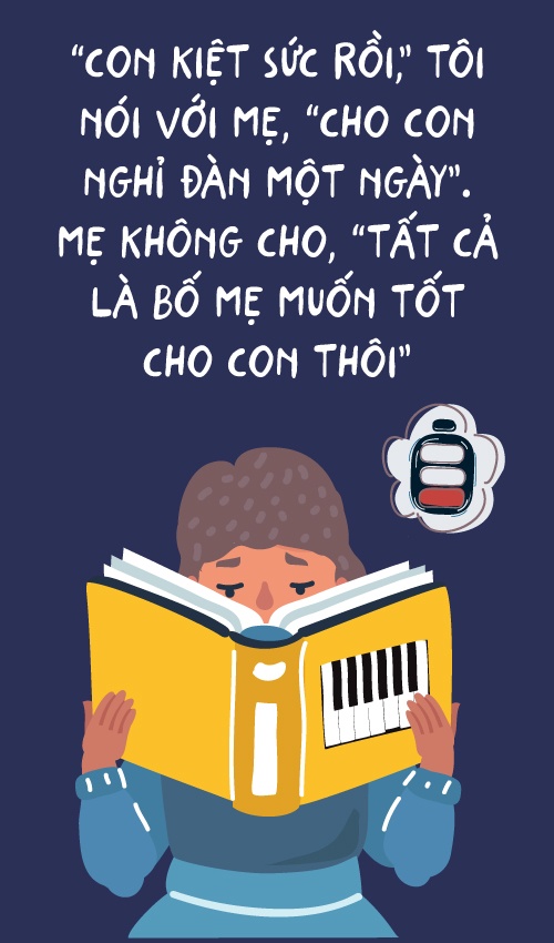 Đến bây giờ tôi vẫn không hiểu sao mình có thể nhồi nhét được khối lượng bài nhiều thế. “Con kiệt sức rồi”, tôi nói với mẹ, “cho con nghỉ đàn một ngày”. Mẹ không cho, “Tất cả là bố mẹ muốn tốt cho con thôi”. Một thời gian dài sau này tôi sợ nhìn vào bản nhạc.