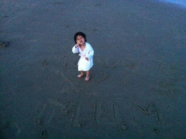 | Mina tinh nghịch trên bãi cát với tên của mình. |