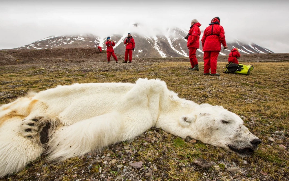 | Gấu trắng chết vì kiệt sức trên đường đi về hướng bắc, tìm kiếm nguồn thức ăn. Bức ảnh chụp tại vùng vịnh phía Tây Svalbard, Na Uy. Tình trạng đóng băng kéo dài tại đây khiến số lượng nhiều loài động vật giảm mạnh do không thích nghi được với môi trường, gây ảnh hưởng tới hệ sinh thái. |