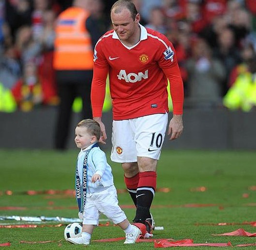 | Cậu cả Kai nhà Rooney lon ton chạy cùng bố trong ngày MU vô địch NH Anh. |