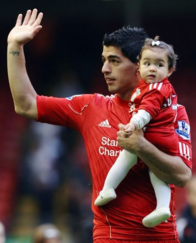 | Chân sút Luis Suarez hãnh diện khoe công chúa nhỏ Delfina trong màu áo đồng phục với bố. |