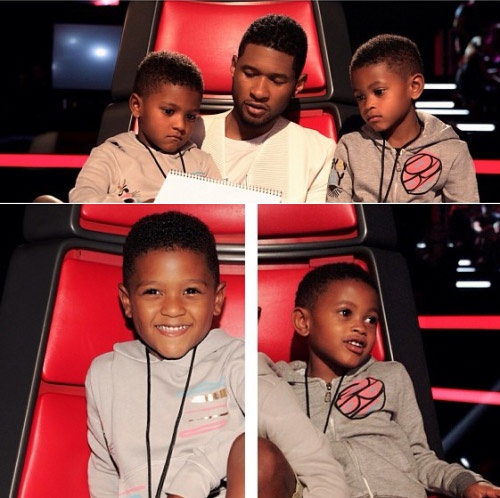 | Usher và hai cậu con trai trên ghế nóng The Voice. |