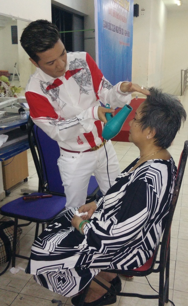 | Mr.Đàm tự tay làm tóc cho cô Ánh Tuyết - mẹ của Hồng Ngọc trước khi cô bước lên sân khấu để hát cùng con gái ca khúc Lệ đá. |