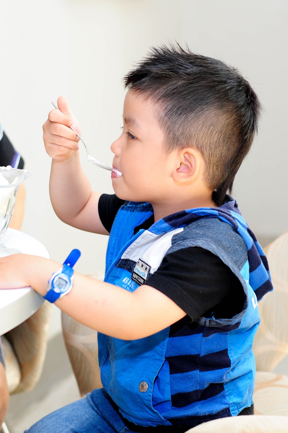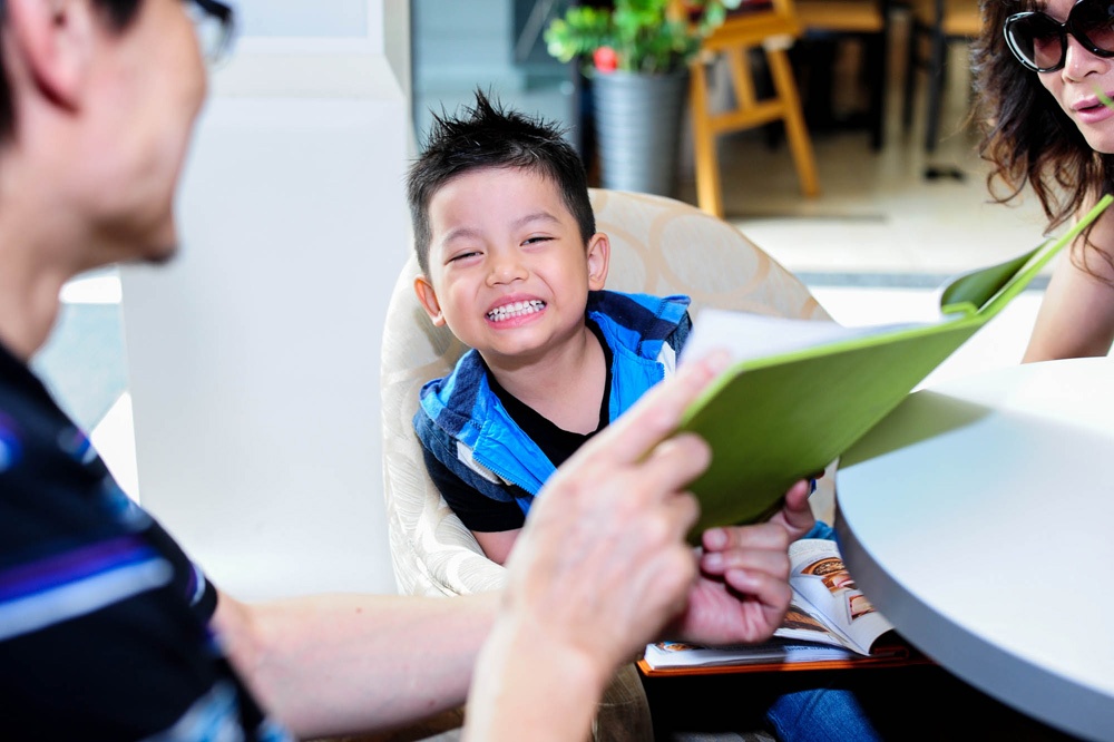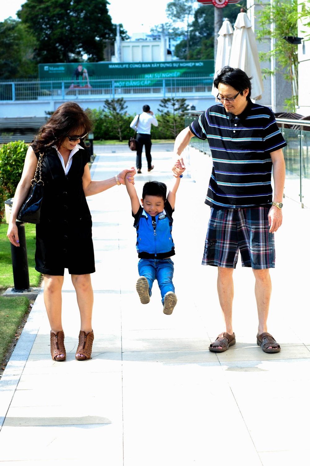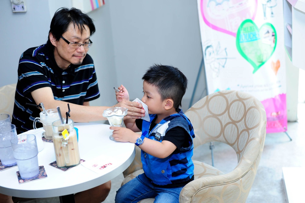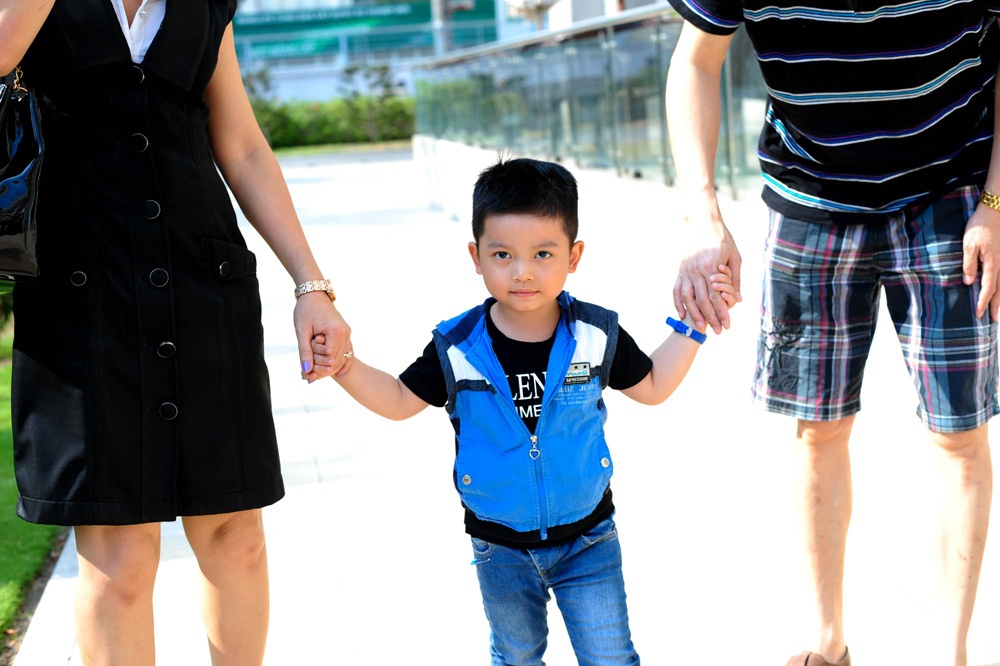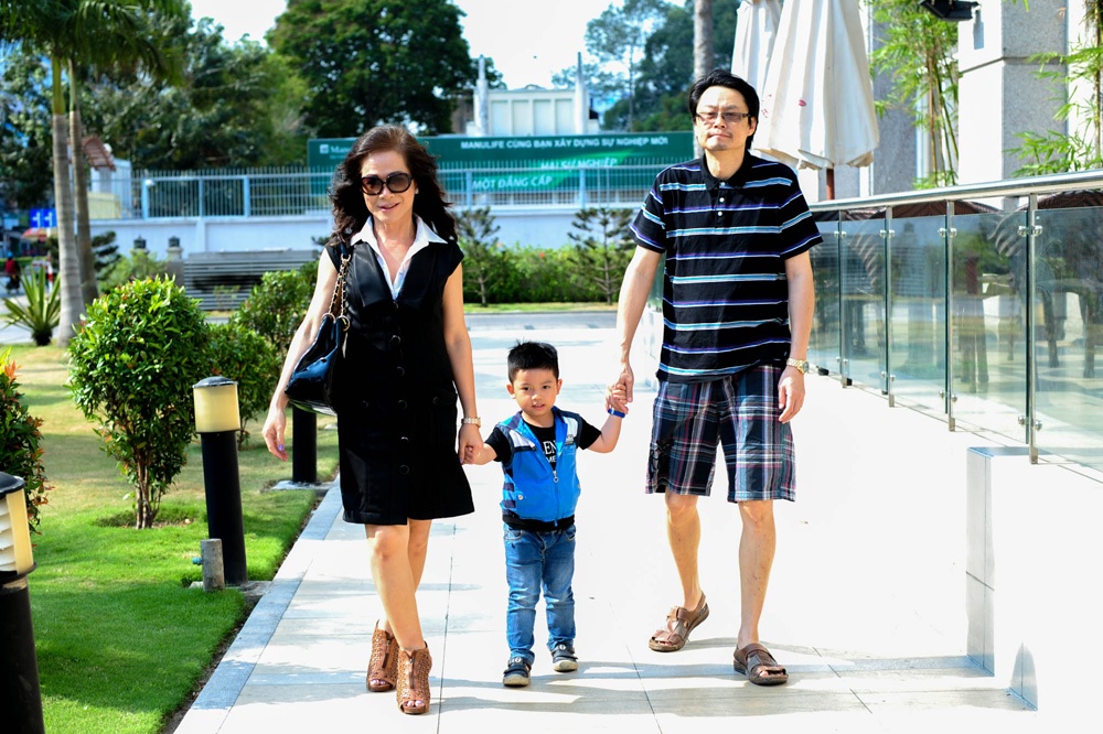 Cậu bé 4 tuổi được ba mẹ nuôi dẫn đi gặp gỡ những người đồng nghiệp tại một quán cà phê ở Sài Gòn. Di Yến Quỳnh cho biết vợ chồng cô cảm thấy hạnh phúc hơn từ khi trong nhà có tiếng cười nói của trẻ thơ.