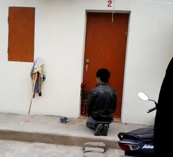 | Chàng trai kiên nhẫn quỳ gối trước cửa phòng trọ bạn gái. |