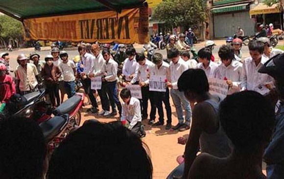 | Hình ảnh nam sinh quỳ gối dưới mưa khiến nhiều người bức xúc. |