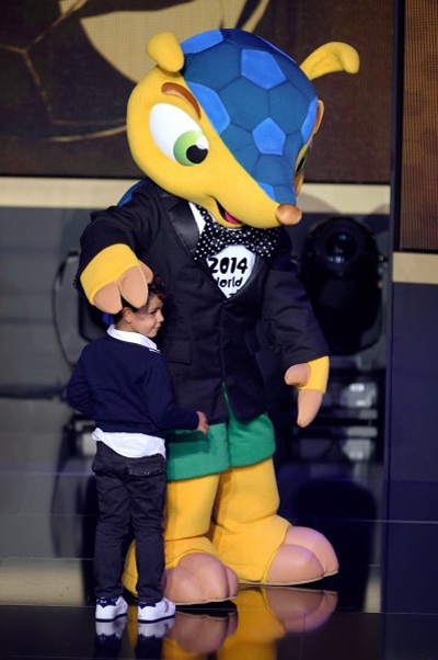 Con trai Ronaldo thích thú chụp hình cùng linh vật World Cup 2014.
