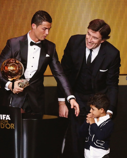 | Ronaldo đưa con trai lên bục vinh quang để cùng nhận giải thưởng. Sau 4 năm chìm dưới cái bóng của Messi, cuối cùng, Ronaldo cũng được xướng tên, trở thành chủ nhân Quả bóng vàng 2013. |