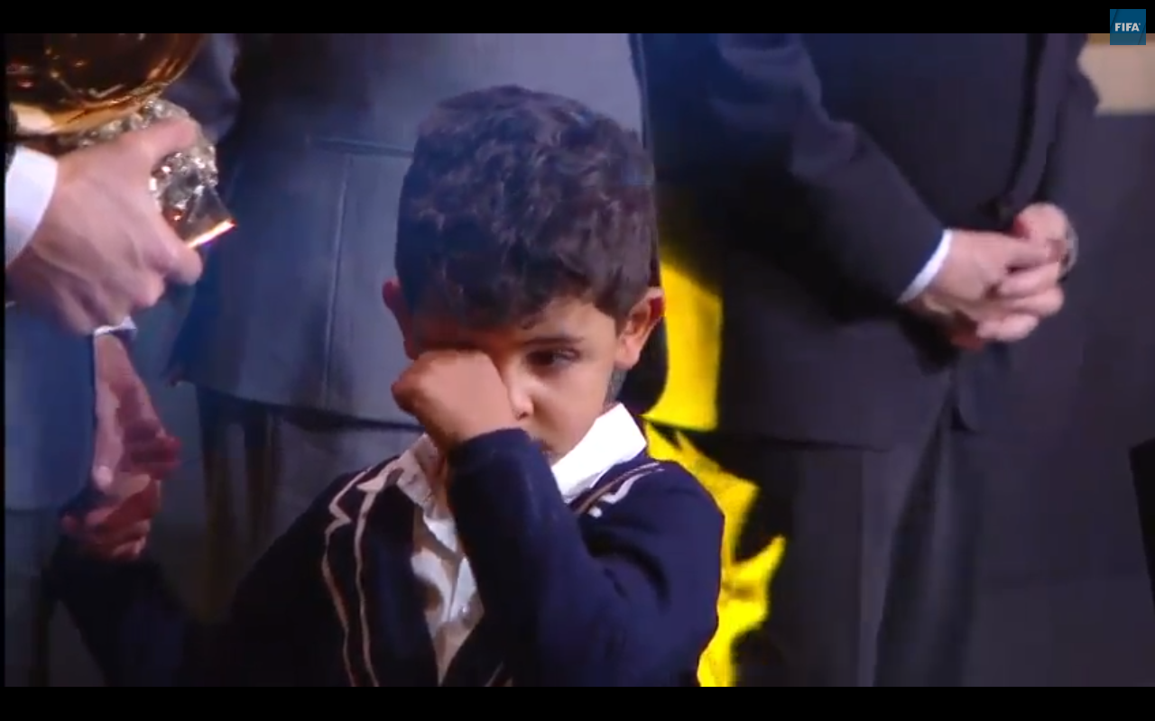 Giây phút Ronaldo nghẹn ngào phát biểu sau khi nhận giải, "tiểu Ronaldo" dù mới 4 tuổi nhưng cũng rưng rưng nước mắt theo bố. Có thể, Ronaldo Jr chưa thể hiểu hết giá trị của danh hiệu bố đang cầm trên tay, nhưng cậu cảm nhận được tình cảm và sự xúc động của bố tại khoảnh khắc thiêng liêng ấy.