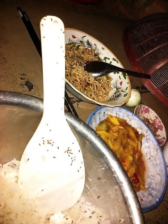 | Ruồi mắt đỏ bu dày đặc trên thức ăn của người dân thôn Đông Bình, xã Nhơn Thọ, thị xã An Nhơn. |