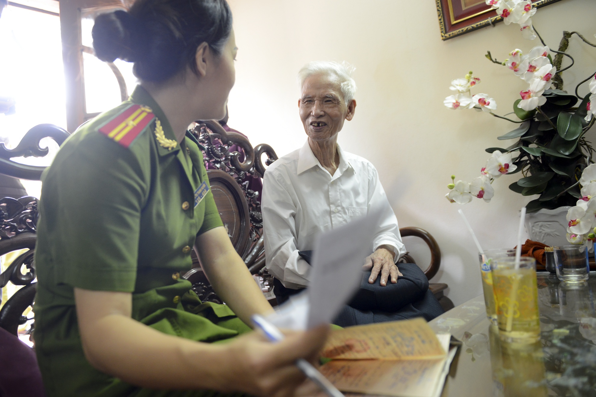 | Ông Đào Xuân Dụ năm nay 85 tuổi là một trong hơn 20 người thuộc danh sách được giúp đỡ làm thủ tục hành chính của phường Thành Công. Ông Dụ đã tự nguyện cho công an quận mượn nhà mình làm phòng thủ tục hành chính bởi khu tập thể nơi đây có nhiều người thuộc diện ưu tiên nhất, thuận tiện cho việc đi lại. |