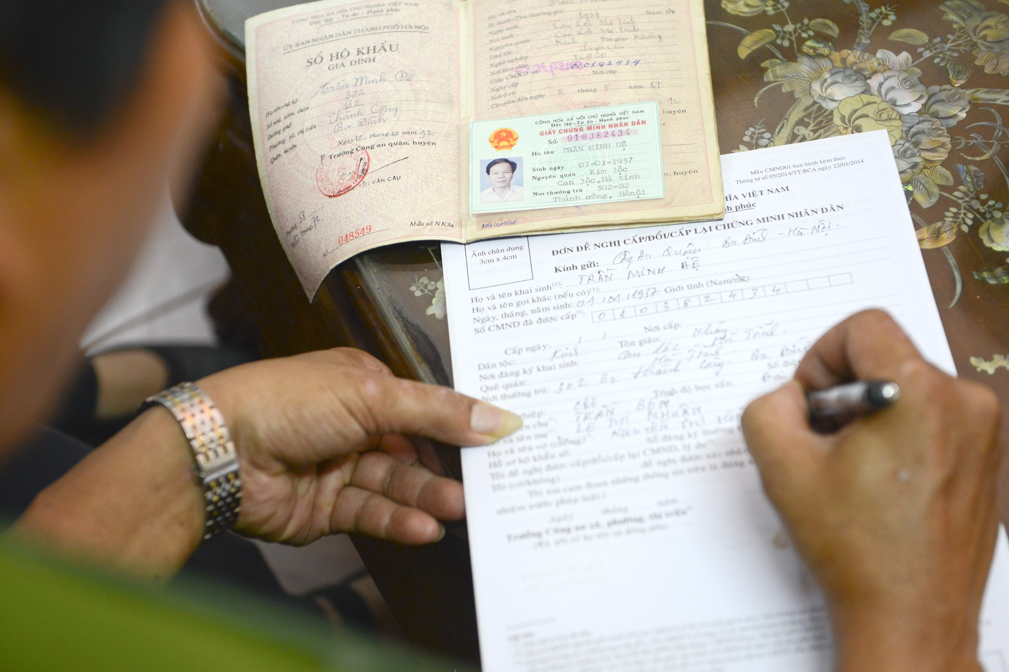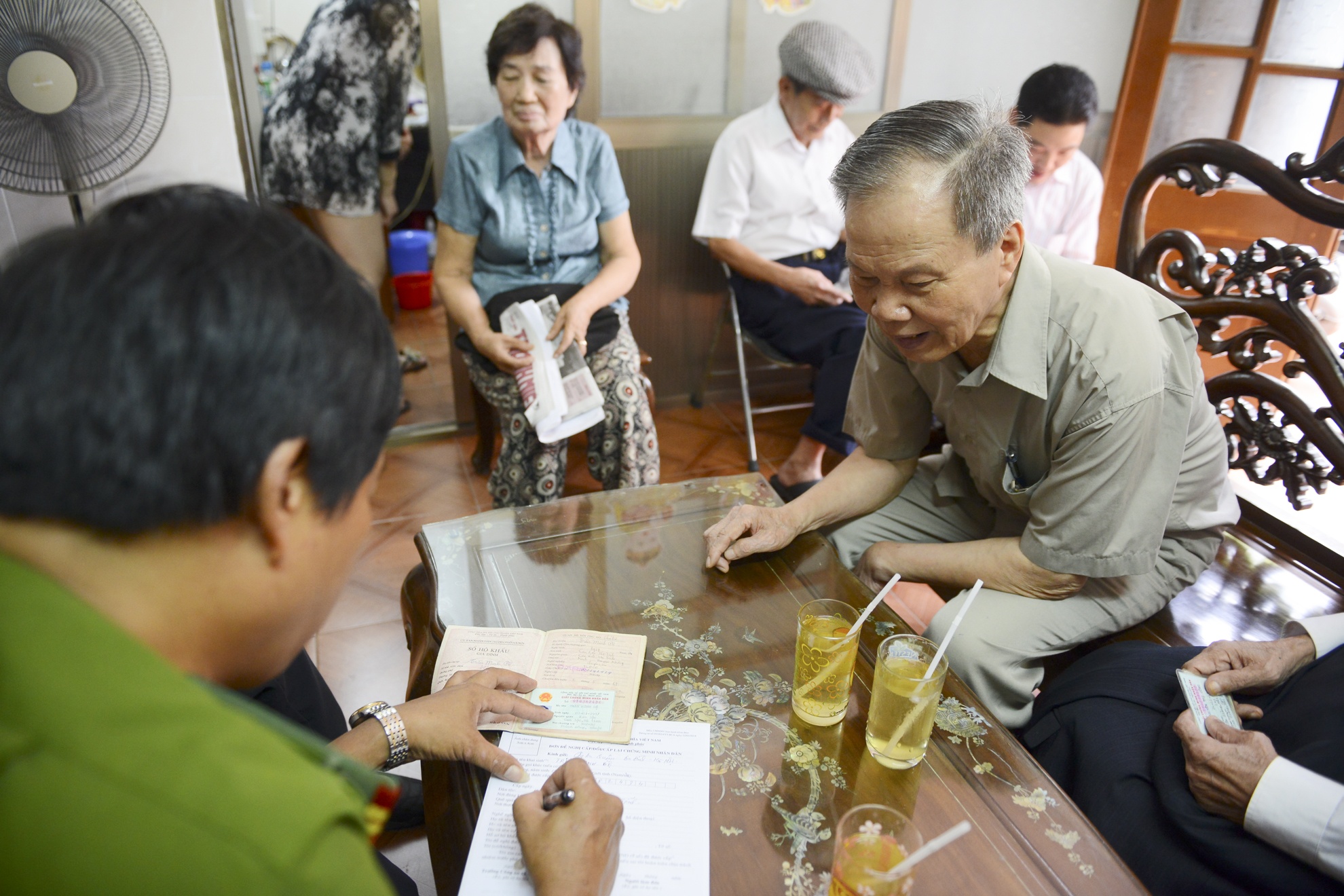 | Được thông báo từ trước, 23 người trong diện già yếu bệnh tật sống trong khu tập thể Thành Công đã có mặt cùng công an phường làm đơn cấp/đổi CMTND và xác minh lý lịch. |
