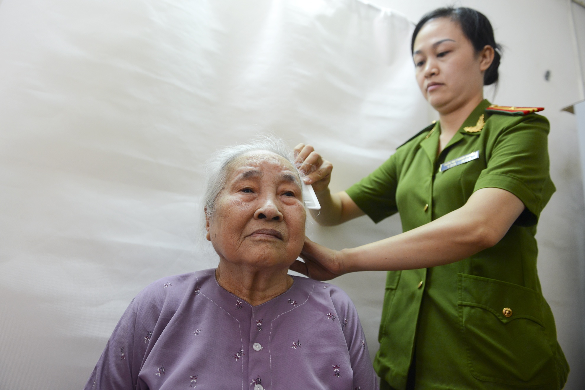 | Thiếu tá Trần Thị Thanh Huyền, CA Quận Ba Đình giúp đỡ các cụ chải tóc gọn gàng trước khi chụp ảnh thẻ. |