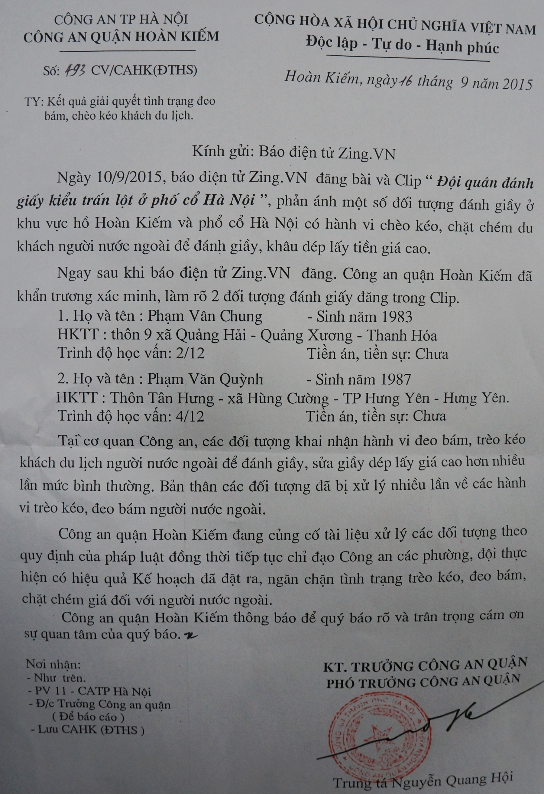 | Công văn phúc đáp kết quả xử lý vụ việc của Công an quận Hoàn Kiếm sau phản ánh của Zing.vn vào tháng 9. |