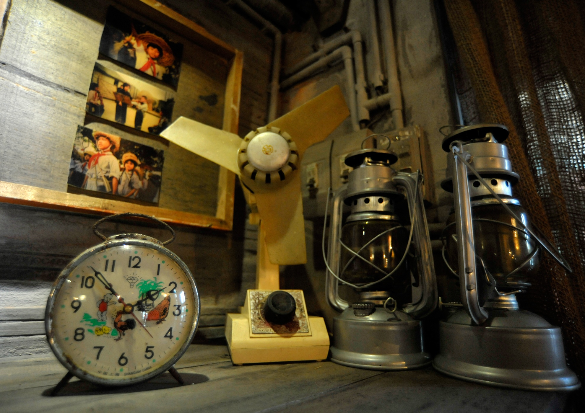 Ở một góc khác, chiếc đồng hồ báo thức, đèn bão (đèn Hoa Kỳ), quạt điện cũ... được chọn làm đồ trưng bày, tạo điểm nhấn.