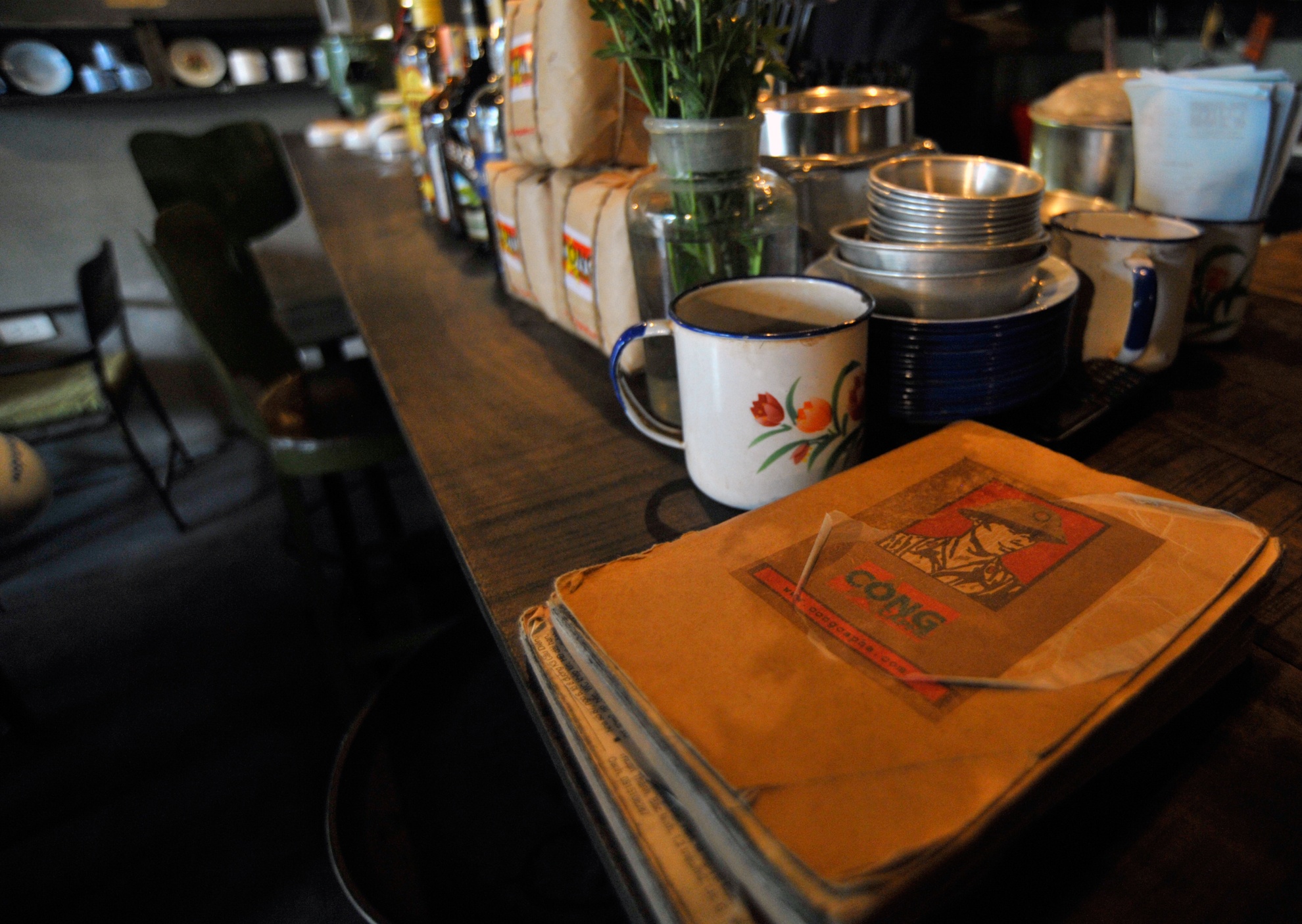 Quyển menu đơn giản, cùng hình ảnh những chiếc cốc, đĩa tráng men từ thời trước cũng là điểm đặc biệt của chuỗi cà phê này.