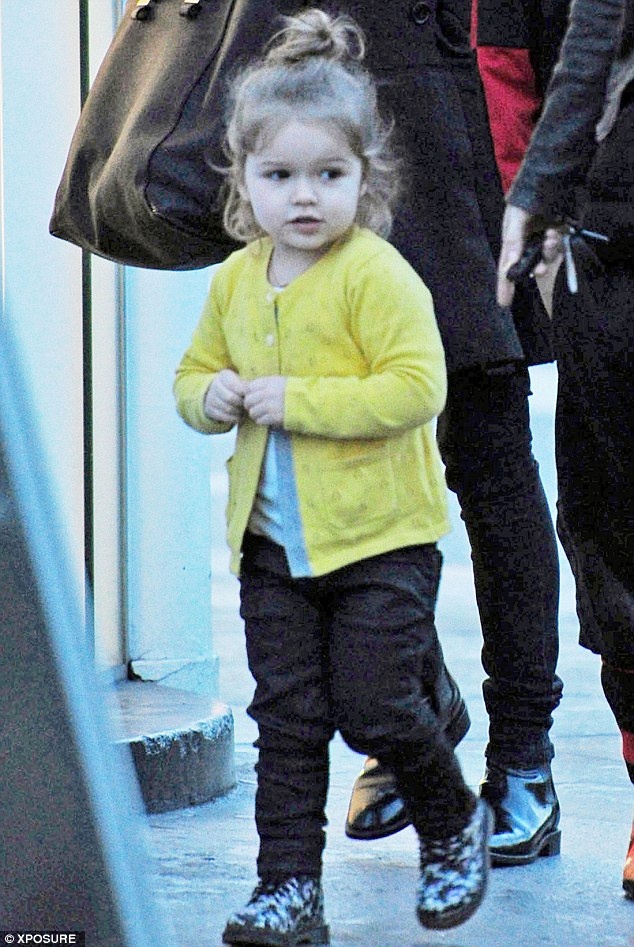 | Harper chưa được 3 tuổi nhưng khá chững chạc. Cô nhóc không cần mẹ bế hay dắt như mọi khi mà thoăn thoắt tự bước đi. Khác với hình ảnh co ro trong cái lạnh New York, công chúa út nhà Beck diện áo len mỏng màu vàng, quần bò, giày thể thao sành điệu. Mái tóc búi củ tỏi càng làm tôn lên vẻ đáng yêu của Harper. |
