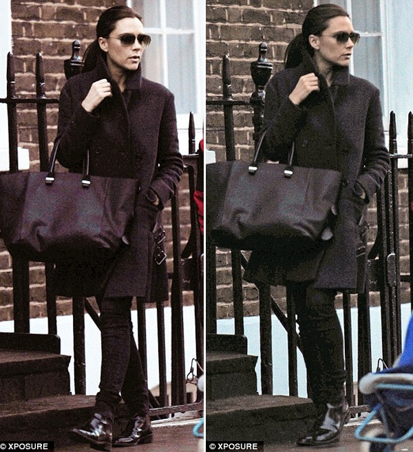 | Bà Becks chọn phong cách giản dị với cả cây đen xuống phố. Điều đặc biệt, nhà thiết kế thời trang 39 tuổi bất ngờ xỏ một đôi giày đế thấp. Đây là một trong những lần hiếm hoi cô chịu xa rời đôi giày cao gót lênh khênh thường thấy. |