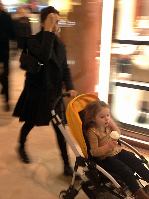 | Chiều chủ Nhật, phóng viên cũng vừa bắt gặp Vic đưa bé Harper đi mua sắm tại Westfield, London. Harper mải mê ăn kem trên xe đẩy vô cùng đáng yêu. |
