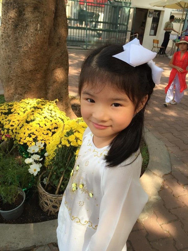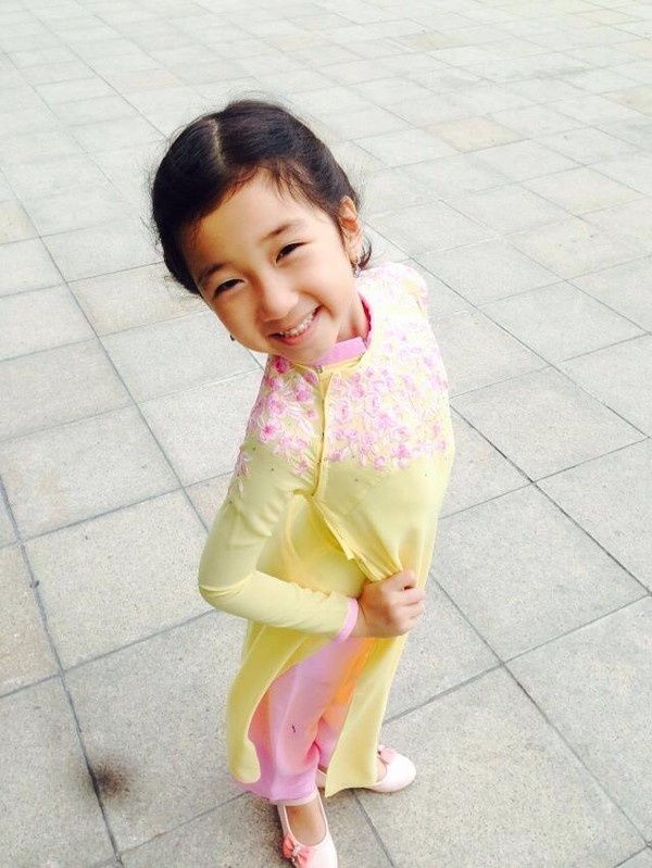 Bé Khánh Linh - con gái của hoa hậu Nguyễn Thị Huyền - thừa hưởng nhiều nét xinh xắn của mẹ. Cô bé tạo dáng nhí nhảnh và vui tươi khi diện áo dài màu vàng thêu hoa màu hồng.