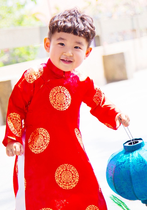 | Quý tử lém lỉnh nhà nam diễn viên Hải Anh tạo dáng "ông cụ non" trong tà áo dài màu đỏ nổi bật. Nam diễn viên thành danh với những vai côn đồ chia sẻ, con trai thừa hưởng nhiều nét tính cách từ bố, rất vui tính, hài hước và hay đùa.