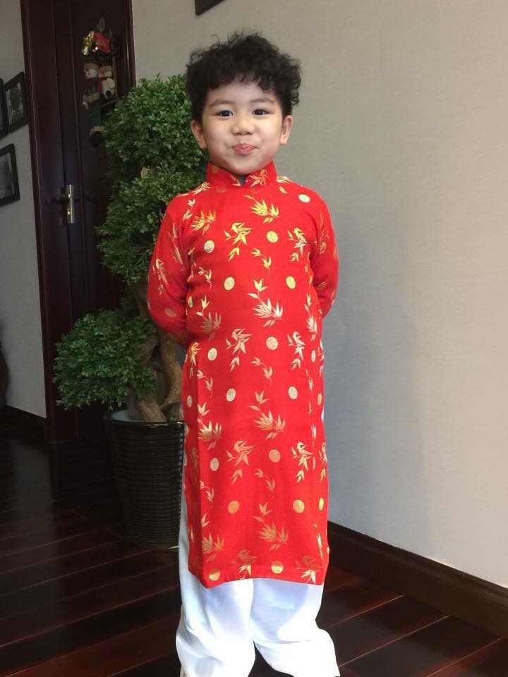 Cậu ấm Kid nhà Diệp Bảo Ngọc trông rất dễ thương khi diện áo dài đỏ họa tiết truyền thống.