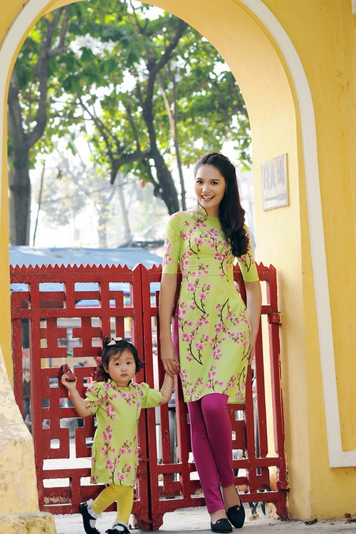 | Hương Giang và con gái cũng chọn tà áo dài trong bộ ảnh năm mới. Công chúa nhỏ của người đẹp được nhận xét thừa hưởng nhiều nét xinh đẹp từ mẹ. |