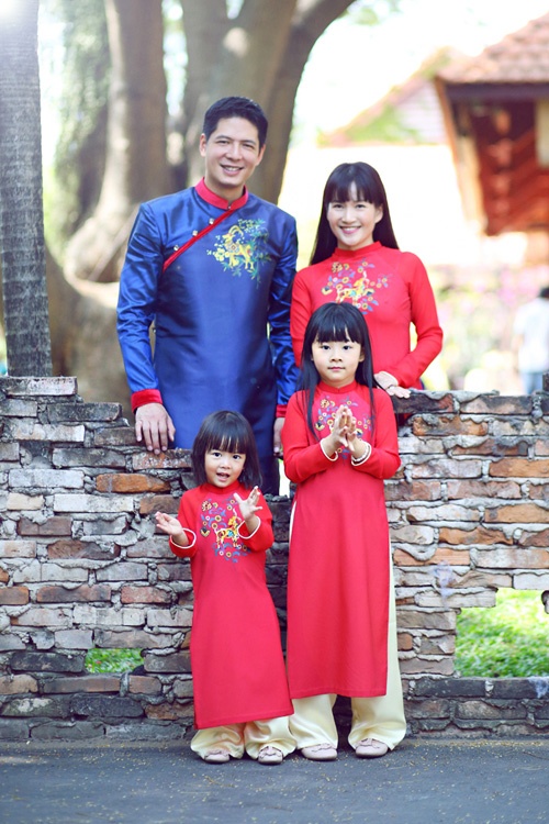 | Gia đình người mẫu, MC Bình Minh cũng đón sắc xuân trong tà áo dài. Trong khi hai công chúa và mẹ Anh Thơ lựa chọn sắc màu đỏ tươi tắn, nam diễn viên Mưa bóng mây lại đầy nam tính và mạnh mẽ với gam màu xanh. |
