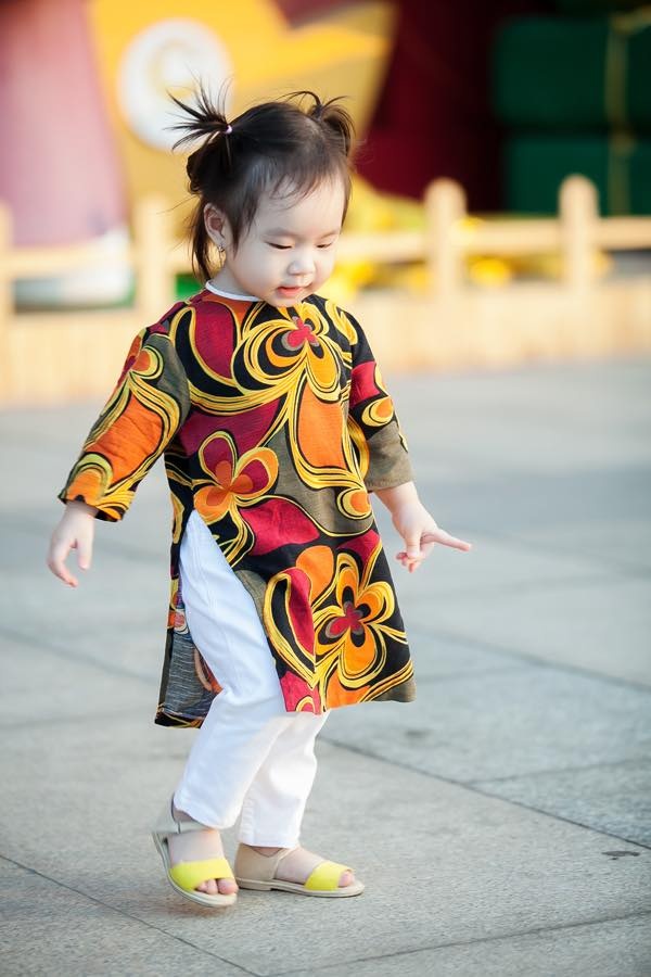 | Cadie Mộc Trà cũng được mẹ Elly Trần diện áo dài xinh xắn. Biểu cảm đáng yêu của công chúa nhỏ trong trang phục truyền thống khiến các fan thích thú. |