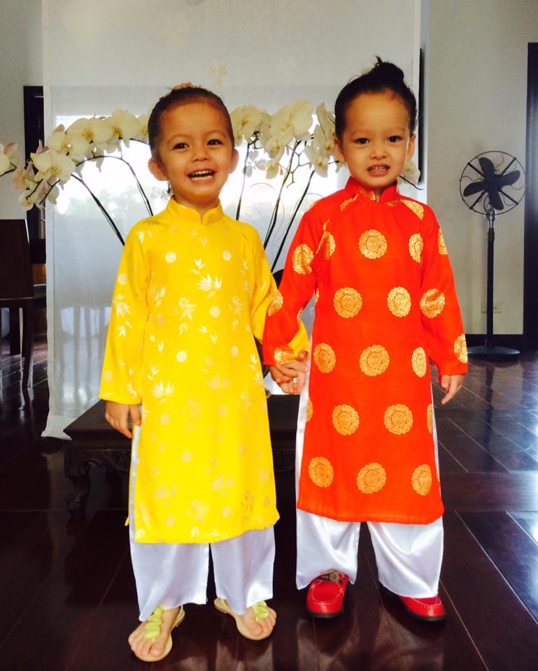 | Hôm 13/2, "cô Bống" cũng chia sẻ hình ảnh của hai nhóc tỳ Tôm và Tép trong bộ áo dài truyền thống của Việt Nam. Theo lời diva, hai bé được mẹ cho ăn diện để tới lớp ăn Tết sớm và học về bánh chưng, 12 con giáp. |