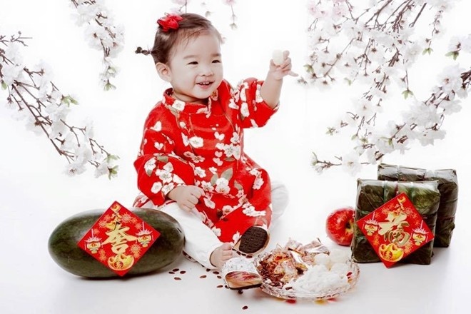 | Công chúa Bo nhà nam MC Phan Anh cũng được mẹ chọn cho tà áo dài nổi bật để cùng gia đình đón xuân về. |