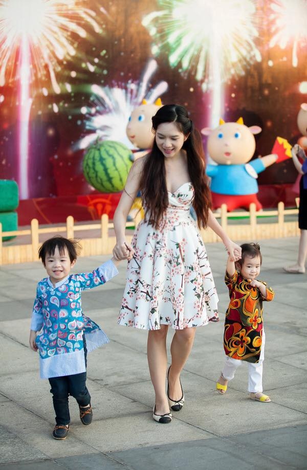 | Trong khi anh cả Rio lại rạng rỡ với gam màu xanh nước biển. Dù mới hạ sinh em bé thứ ba được vài tháng song Minh Hà khiến nhiều bất ngờ với vóc dáng thon gọn, thanh mảnh. Cô nắm tay hai con vui đùa dưới phố trong bộ ảnh đón xuân. |