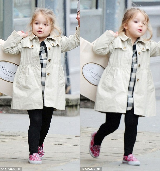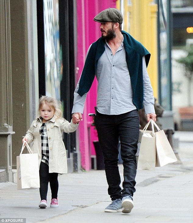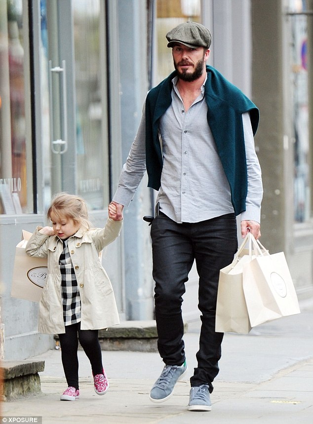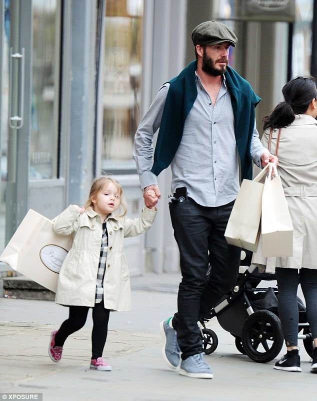 | Cuối tuần, cựu ngôi sao tuyển Anh David Beckham đưa cô con gái út Harper Seven xuống phố đi dạo và mua sắm. Hai cha con nổi tiếng bậc nhất thế giới được cánh phóng viên bắt gặp khi vừa bước ra từ cửa hàng thời trang trẻ em Bonpoint tại trung tâm thành phố London. |