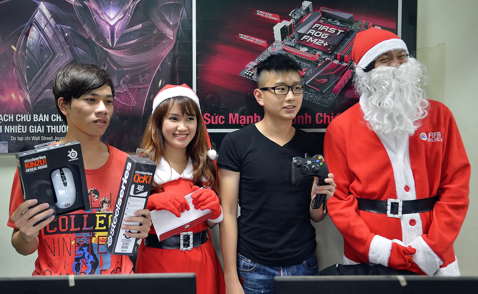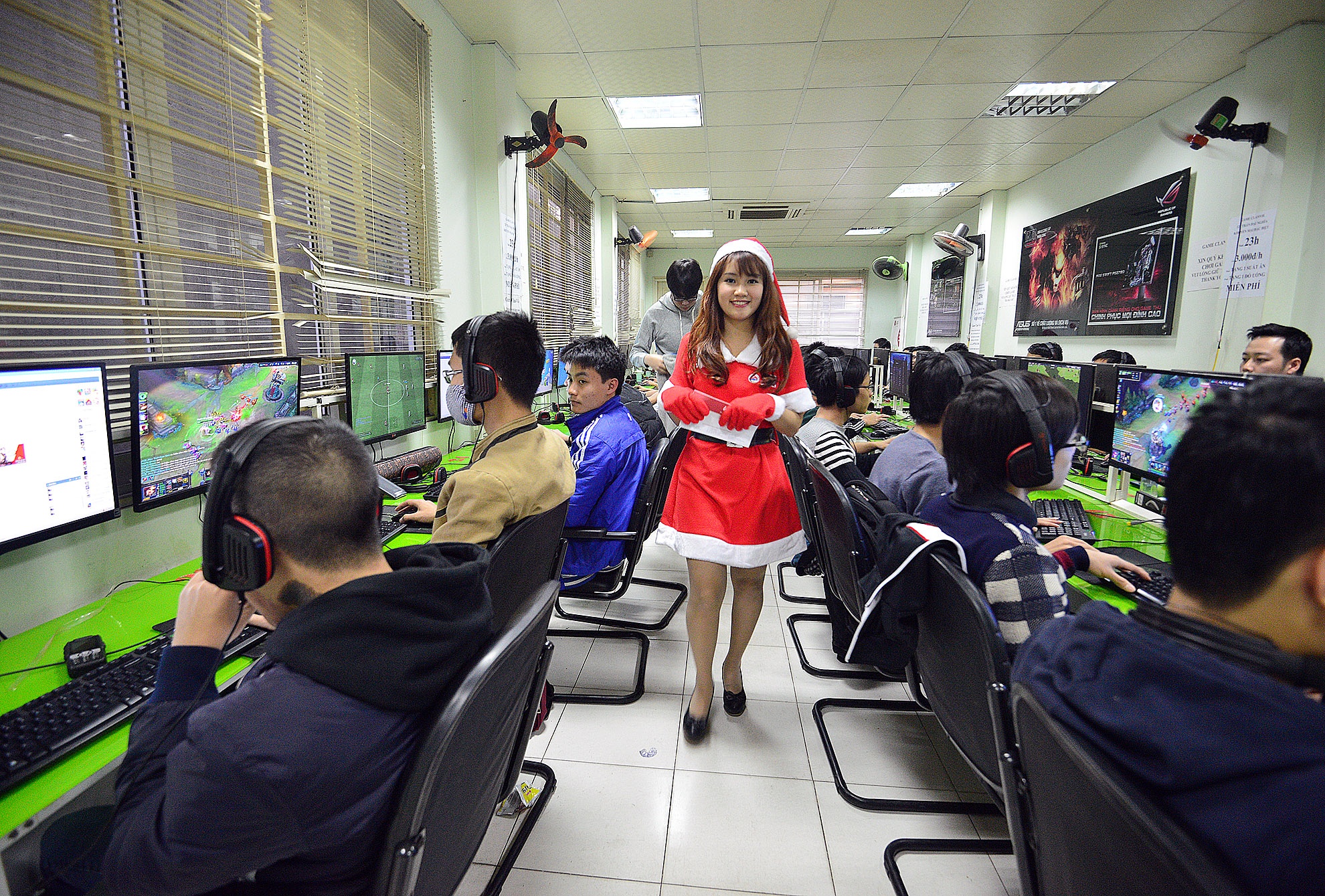 | Trong bộ trang phục Công chúa tuyết, cô đến các cửa hàng Internet tặng quà miễn phí. Nhiều người bất ngờ khi có một cô gái trẻ xinh đẹp đến chào hỏi lễ phép rồi chúc tụng. |