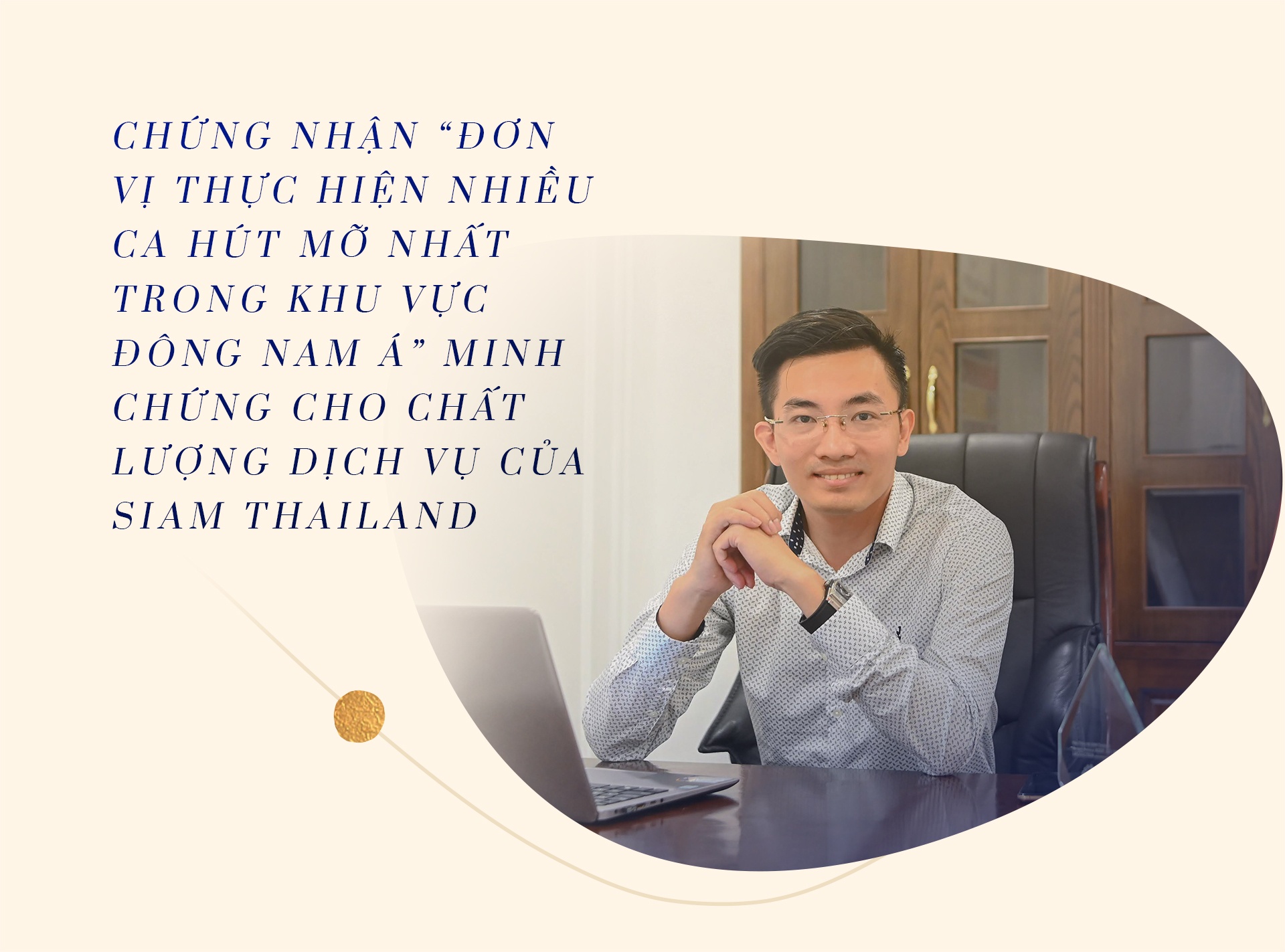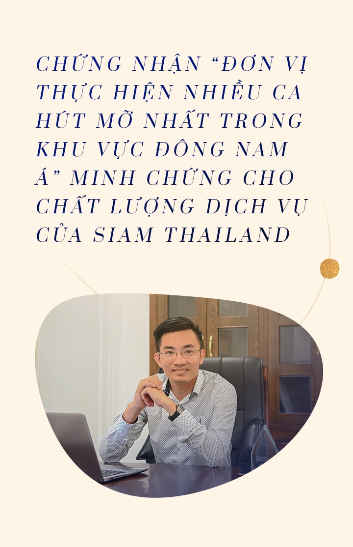 Đội ngũ chuyên gia giàu kinh nghiệm, hệ thống thiết bị công nghệ cao thường xuyên cập nhật giúp Siam Thailand tạo được dấu ấn ở mảng hút - cấy mỡ. Nỗ lực của Siam Thailand được Human Med trao chứng nhận Đơn vị thực hiện nhiều ca hút mỡ nhất trong khu vực Đông Nam Á.