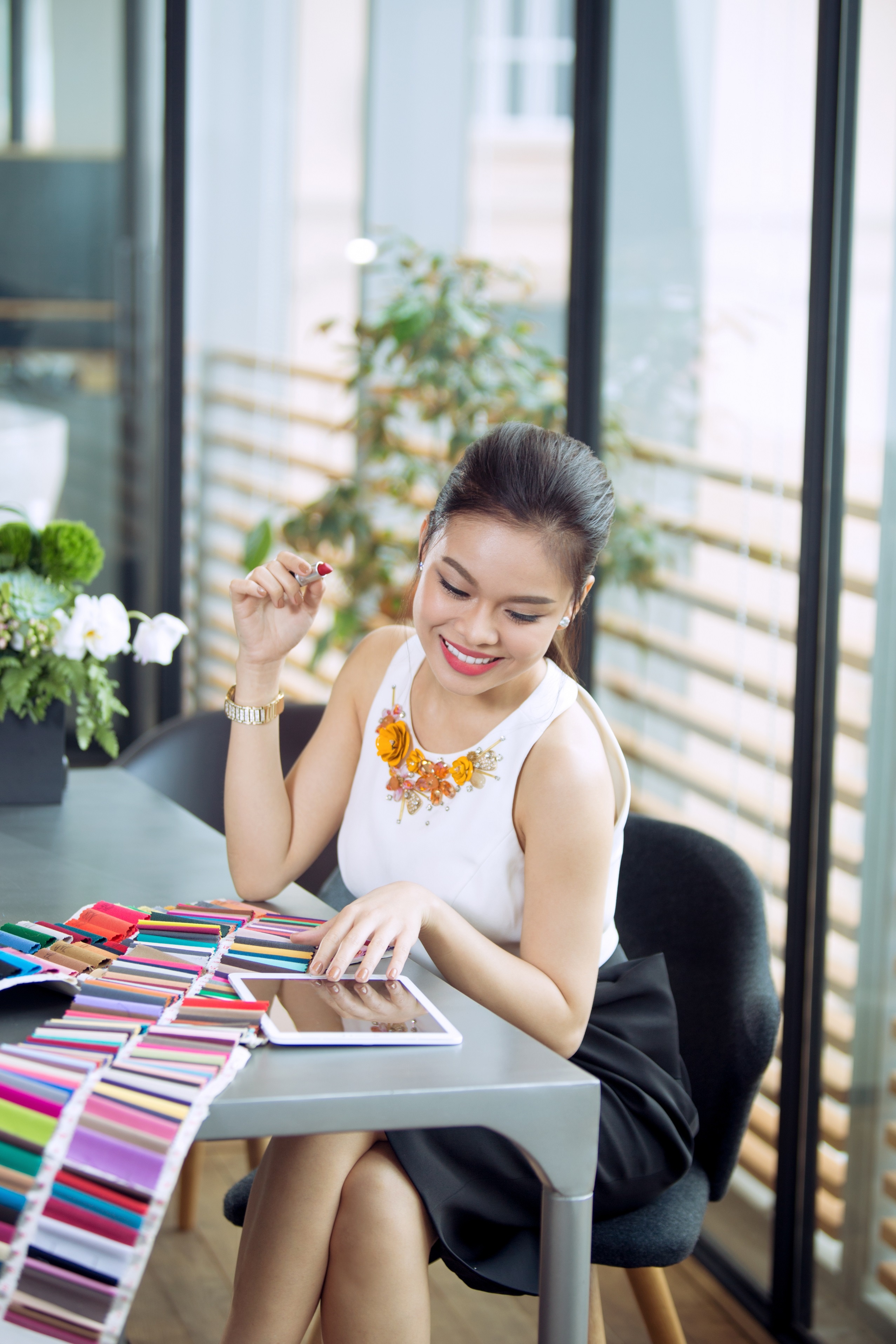 Chia sẻ về phong cách thời trang của mình, người mẫu, MC-VJ Đàm Phương Linh cho biết: “Là tín đồ của phong cách tối giản, Linh luôn ưu tiên chọn những trang phục mỏng nhẹ, thoải mái như áo see-through, túi xách nhỏ gọn, sandals đế bệt. Công thức này cũng áp dụng cho những sản phẩm công nghệ của Linh. Đơn cử như Samsung Galaxy Tab S2 mà Linh cưng nhất, chỉ mỏng như ba đồng xu xếp lại nên vừa hài hòa với tổng thể trang phục, vừa dễ dàng selfie bằng một tay”.