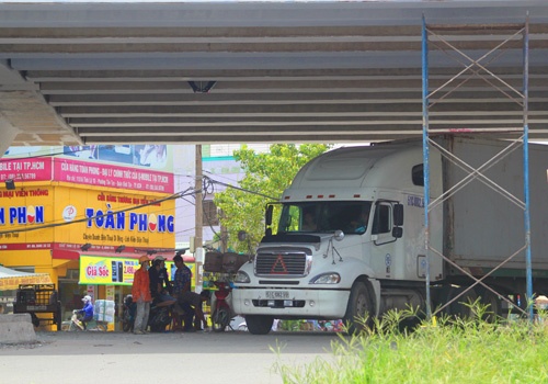 Tại ngã tư này, các loại phương tiện qua lại rất đông. Nhiều xe container, tải lớn rất khó khăn để tránh các giàn giáo này vì chỉ cần va chạm nhẹ thì sẽ gây hậu quả nghiêm trọng. Một số người đi đường lắc đầu ngao ngán và lo sợ cho sự liều lĩnh của những công nhân này.