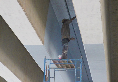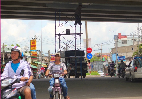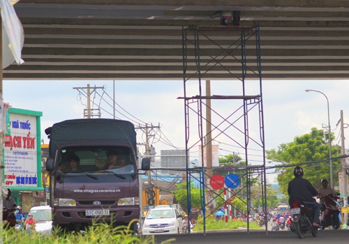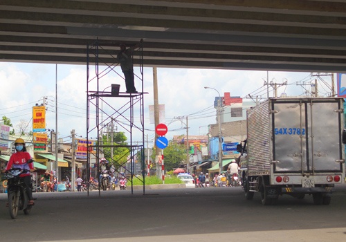 Cầu vượt QL1A - Tỉnh lộ 10 (P.Tân Tạo, Q.Bình Tân, TP.HCM) đang trong giai đoạn hoàn thành. Sáng 8/8, một số công nhân dựng 2 giàn giáo 3 tầng giữa ngã tư để quét sơn dạ cầu. Những người này đứng chới với để quét sơn mà không có dây bảo hộ; còn giàn giáo dựng giữa đường không có hàng rào bảo vệ hoặc người đứng cảnh báo xe cộ.