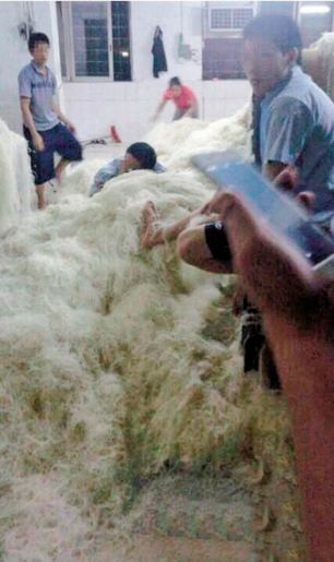 | Các công nhân đạp chân và ngủ trên đống mì sợi dưới sàn nhà. Ảnh: Daily Mail |